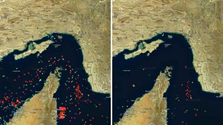 Timelapse shows how sea traffic was much higher on 12 March 2025 (left) around the Strait of Hormuz than 12 March 2026 (right)